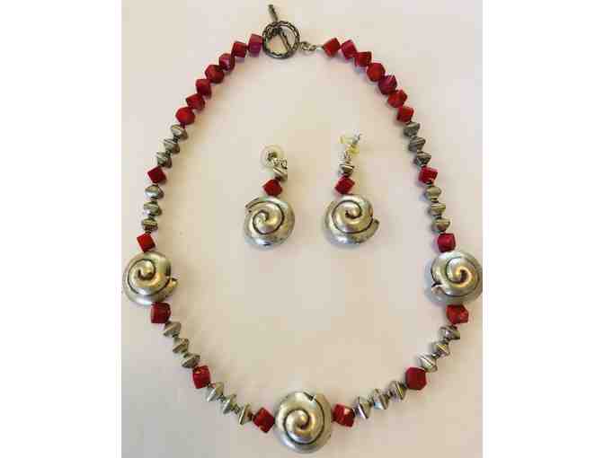 Beautiful matching silver and red coral (stone) necklace (8.5" long) and earringsmake a winning combination for any outfit or occassion.