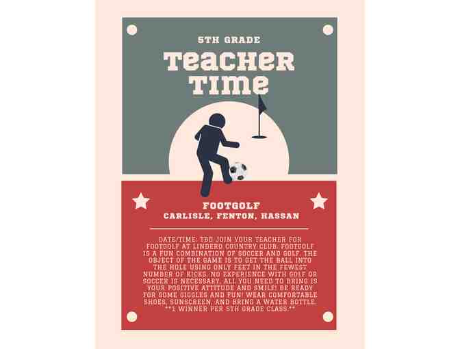 Date/Time: TBD Join your teacher for footgolf at Lindero Country Club. Footgolf is a fun combination of soccer and golf. The object of the game is to get the ball into the hole using only feet in the fewest number of kicks. No experience with golf or soccer is necessary, All you need to bring is your positive attitude and smile! Be ready for some giggles and fun! Wear comfortable shoes, sunscreen, and bring a water bottle. **1 Winner per 5th Grade Class.**