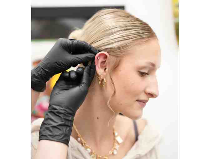 The amount covers the cost of 2 lobe piercings with our piercer Verin, including standard implant-grade titanium jewlery.