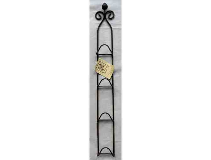 This is a vertical mini plate holder display. It is 24 inches tall, 2.5 inches wide and will hold 4 mini plates. It is a sturdy, metal, and rust colored.