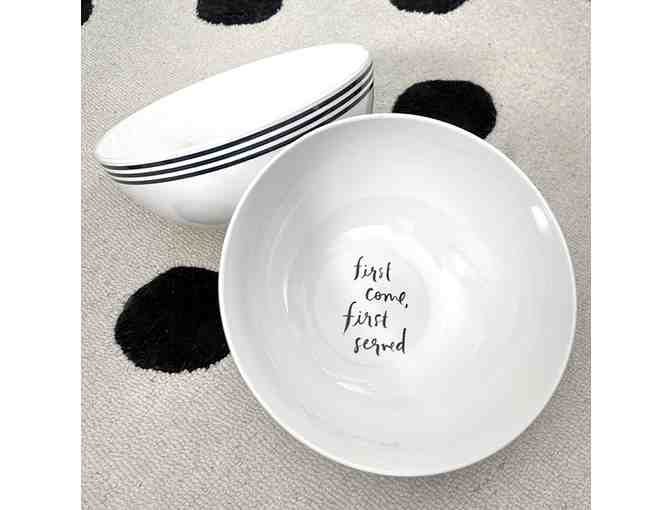 Salut! Melamine Serving Bowl by Kate Spade. Features bold black and white stripes on the rim and the phrase "First Come, First Served" inside. Playful design to add a dash of chic to any meal.
