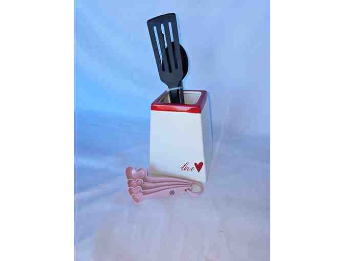 Cute container with a heart and Love signature to charm your kitchen counter and hold tools at the same time.
