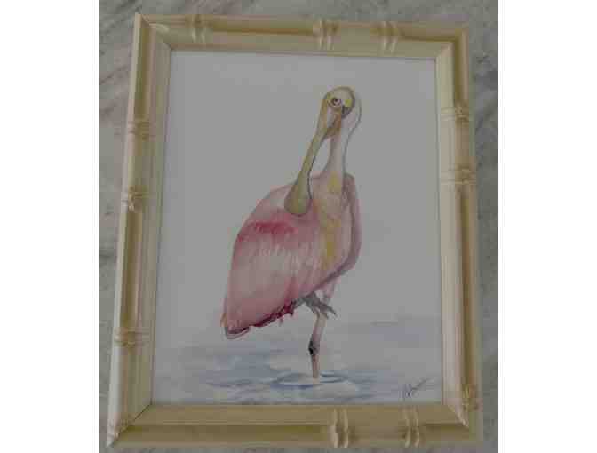 you are bidding on a lovely watercolor of a Rosette Spoonbill by this local artist. Signed and framed. Frame measures 9 1/2 X 12 1/2